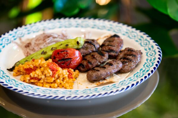 Özel Flory ızgara köfte , Buğday pilavı,sumaklı soğan ,ızgara domates biber ile.