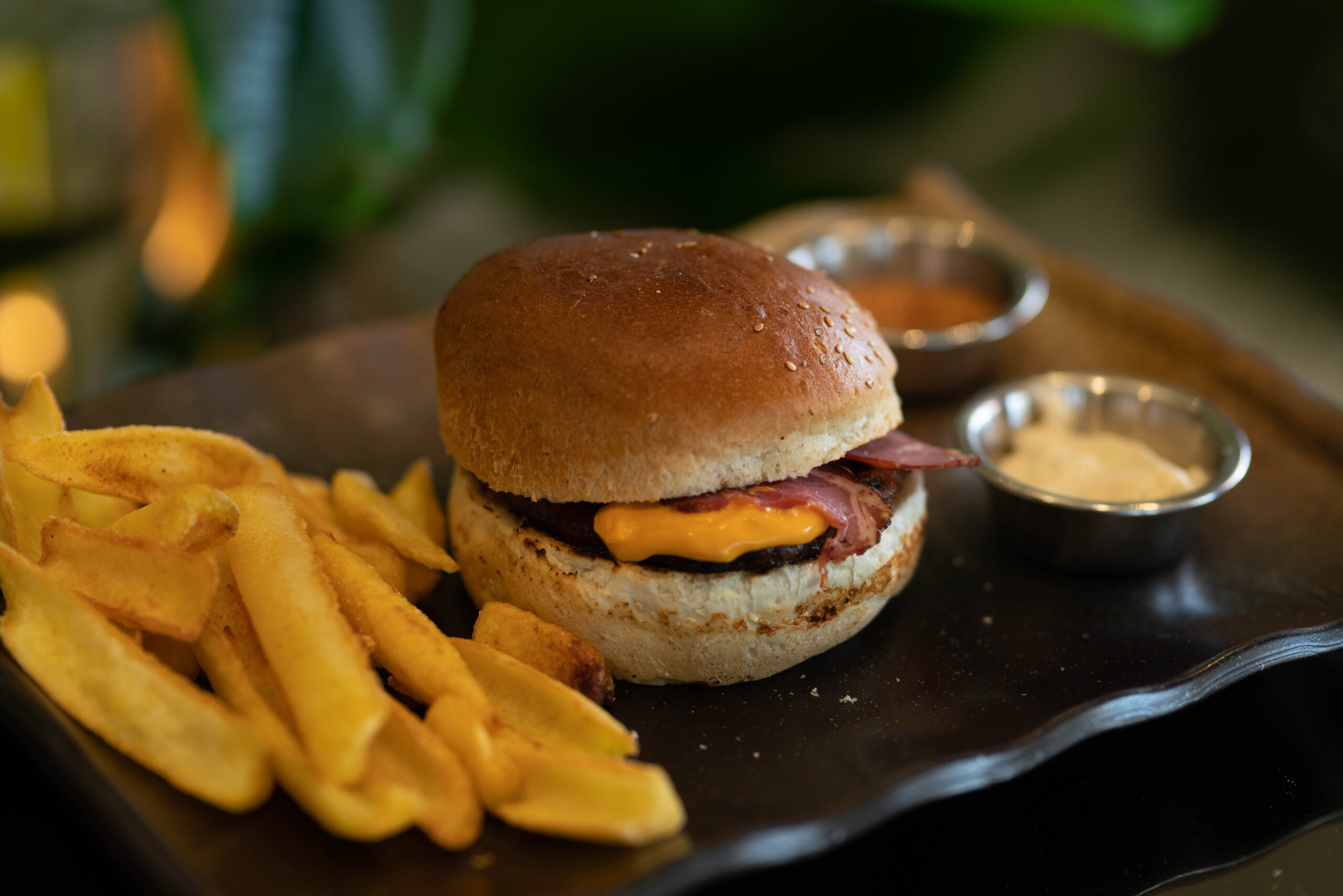 burger köftesi, Kuru et, Chedar peyniri, Karamelize soğan, Patates kızartması