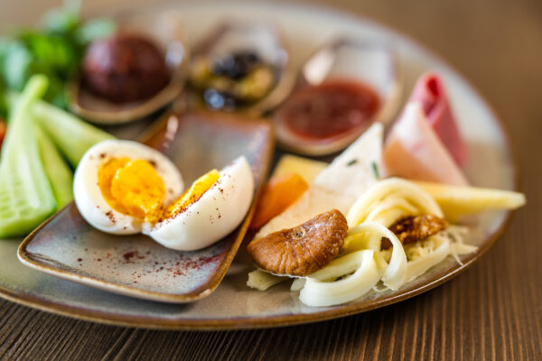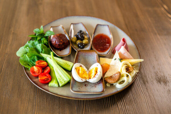 Kahvaltılık sos, Bal ve Tereyağ, Karışık zeytin, Beyaz peynir, Eski kaşar, Çeçil peyniri, Çeri domates, Çengelköy salatalık, Roka, Maydanoz, Haşlanmış yumurta, Sınırsız çay