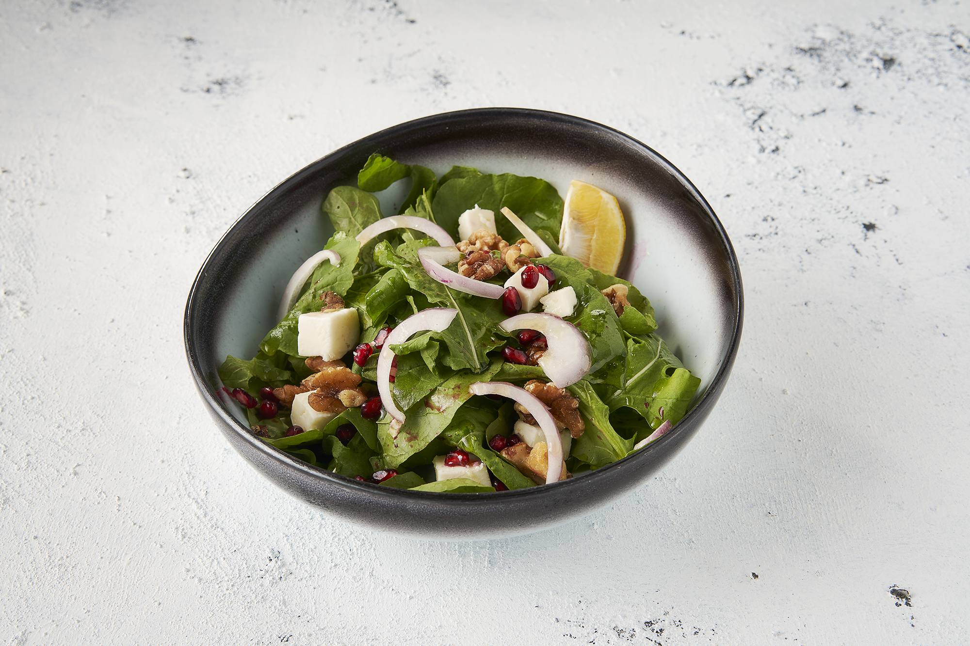 Roka, Beyaz peynir, Ceviz içi, Kırmızı soğan, Nar, Hardal sosu