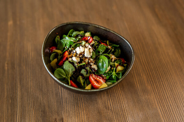 Çilek, Kavrulmuş fındık, Semiz otu, Balzamik glaze, Nar ekşili vinegret sos, Beyaz peynir, Portakal segment, Yeşil elma