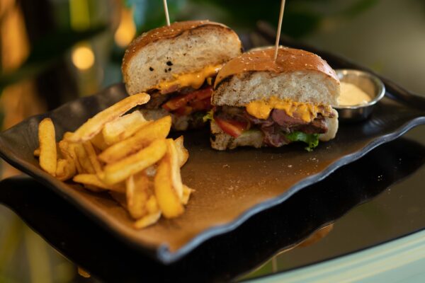 Kuzu ve Dana eti Karışımlı Hamburger Köftesi, Domates, Marul, Karamelize Soğan, Kutu et, Cheddar Peyniri, Flory sos, Patetes Kızartması.