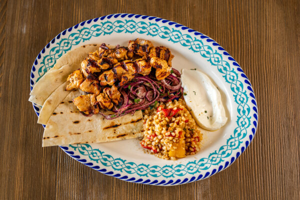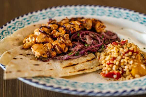 Şefin özel şaşlık sosu ile marine edilmiş tavuk parçalarına sumaklı ve maydanozlu kırmızı soğan salatası ve köz biberli kimyonlu buğday pilavı eşlik ediyor. Sarımsaklı yoğurt ise bu tabağın olmazsa olmazı.